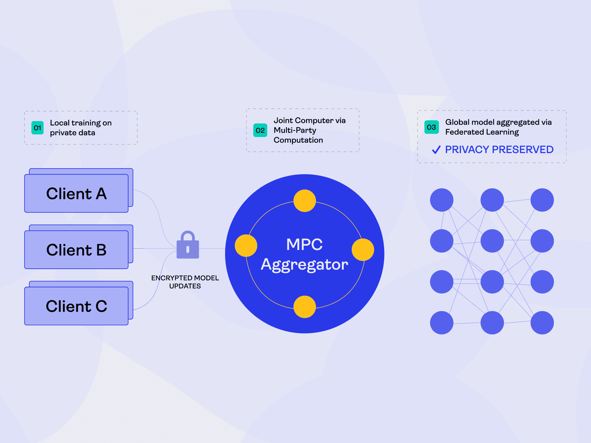 Stoffel's MPC protocol combines the updates without any party being able to read another's contribution. The computation happens jointly; the inputs stay hidden.